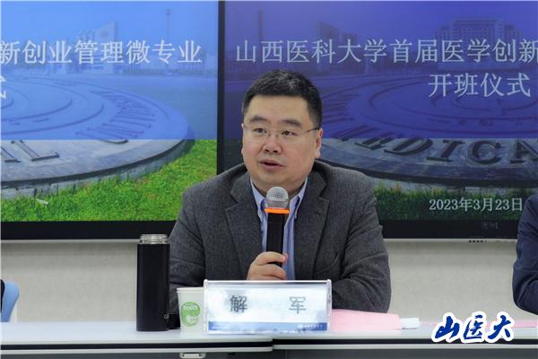 3月23日中午,我校在中都校区教学办公楼三层TLB教室举办了首届医学创新创业管理微专业开班仪式。校长解军参加开班仪式并讲话,教务部、学生工作部、毕业生就业指导中心负责人和创新创业学院全体师生参加启动仪式。启动仪式由教务部副部长、创新创业学院副院长张亮主持。