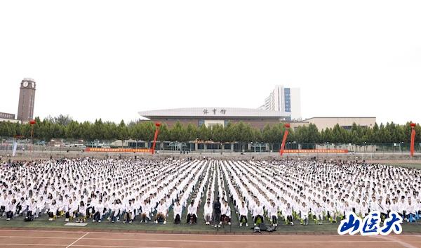 赵斌领誓《医学生誓言》。全体新生身穿圣洁的白大褂整齐排列,高举右拳庄严宣誓,接受作为一名医学生的精神洗礼,誓言铿锵,响彻校园。