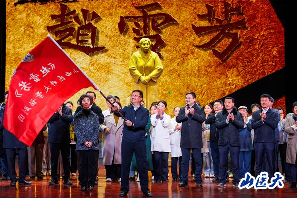 话剧《赵雪芳》以艺术的表达方式,用“身边人”演“身边事”,用“身边事”育“身边人”,表达了我校新医德教育的目标指向和方法指引,使广大学子在学习中深刻体会新医德内涵,在演出中充分表达人物的精神风貌,在传播中体悟新医德的践行路径,感动自己、感染他人。演出中,现场多次响起热烈掌声,为赵雪芳高尚的医德鼓掌,为赵雪芳全心全意为乡亲们、为广大患者热心服务的情怀和敬业精神鼓掌。演出结束后,校领导班子成员走上舞台和演员们一一握手,充分肯定和鼓励了同学们精彩的表演,王军为《赵雪芳》话剧团授旗,让雪芳精神在一代代山医学子中接续传承。