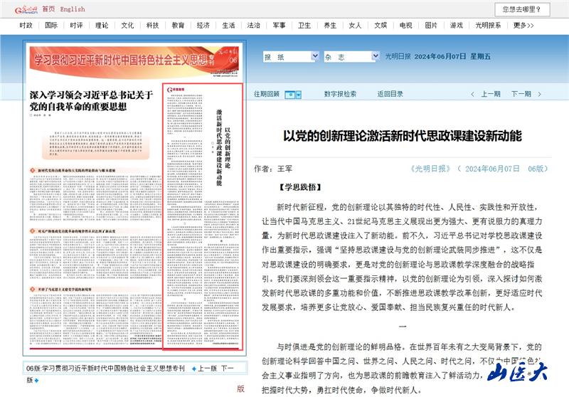 6月7日,《光明日报》第6版“学习贯彻习近平新时代中国特色社会主义思想专刊”刊发我校党委书记王军的署名文章《以党的创新理论激活新时代思政课建设新动能》。