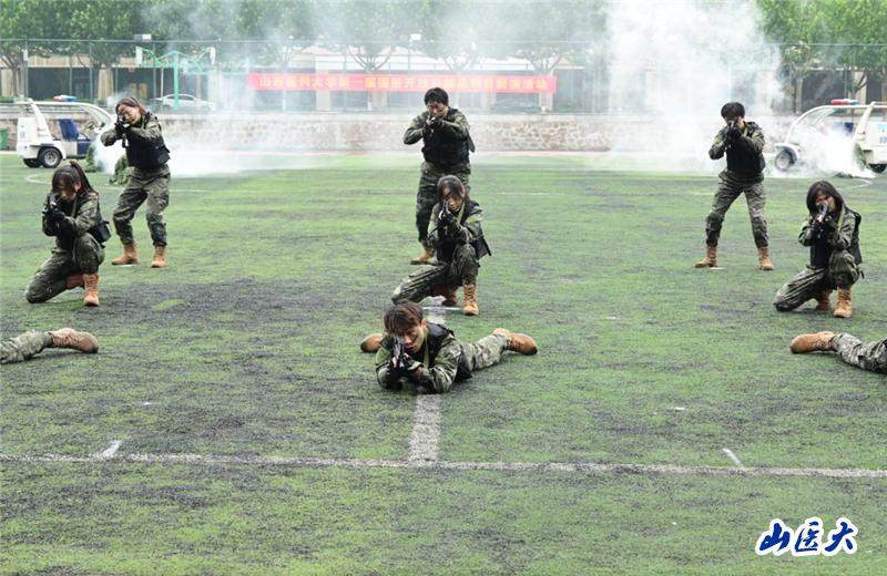 活动现场,国旗班礼宾枪分队30名标兵,手持56式礼宾用枪,为大家展示了历经3个月艰苦训练的成果——枪操,他们身姿矫健,步伐铿锵,动作整齐划一,诠释了坚韧弘毅的山医精神。随后,学校首支反恐防暴志愿小分队9名全副武装的战斗员,乘坐两辆巡逻车迅速到达操场中心,在硝烟中展示了反恐搜索、射击、机动、手语等战术动作科目。现场观摩的师生还来到学校征兵工作站进行参观,上了一堂国防教育微课。讲解员介绍了国防知识,观看了解放军英勇战斗系列视频,进一步提升了师生对参军报国,保卫祖国统一的豪情壮志。