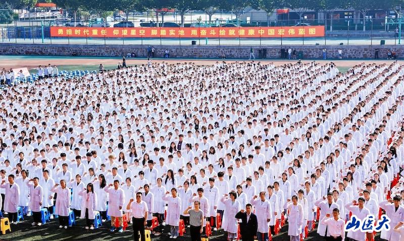 第二临床医学院党委书记安健领誓《医学生誓言》。全体新生身穿圣洁的白大褂,排列整齐,高举右拳庄严宣誓,坚定作为一名医学生的初心使命,誓言铿锵有力。