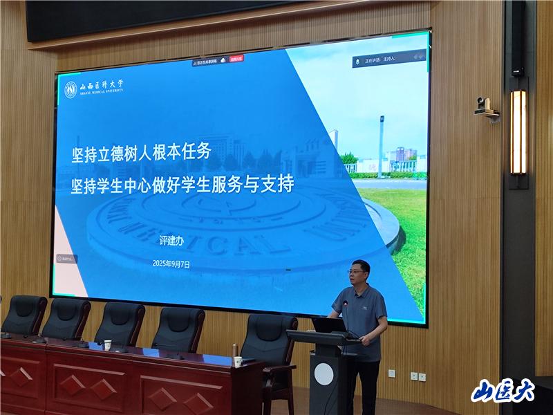 覃凯以“坚持立德树人根本任务,坚持学生中心做好学生服务与支持”为主题,系统介绍了我校审核评估的整体安排、教育教学工作的基本概况、学生支持与服务体系建设情况以及广大学生在迎评期间应注意的事项。他强调,教育教学评估是对学校育人成效的全面检验,希望同学们充分认识到评估工作的重要意义,自觉规范日常行为,以积极向上的精神风貌共同助力学校高质量发展。