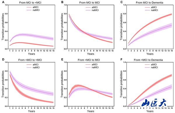 Figure 3 Transition probability curves for participants with aMCI and naMCI over 15 years