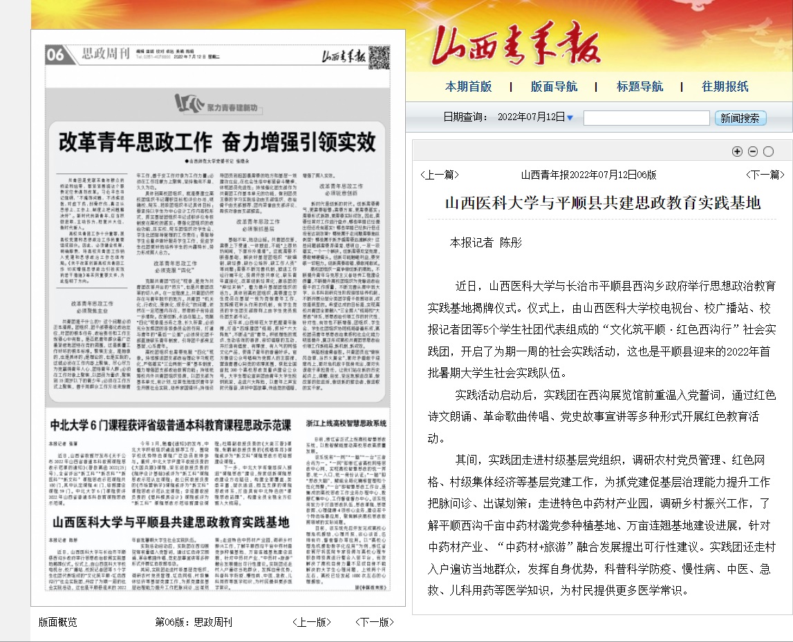 其间,实践团走进村级基层党组织,调研农村党员管理、红色网格、村级集体经济等基层党建工作,为抓党建促基层治理能力提升工作把脉问诊、出谋划策;走进特色中药材产业园,调研乡村振兴工作,了解平顺西沟千亩中药材潞党参种植基地、万亩连翘基地建设进展,针对中药材产业、“中药材+旅游”融合发展提出可行性建议。实践团还走村入户遍访当地群众,发挥自身优势,科普科学防疫、慢性病、中医、急救、儿科用药等医学知识,为村民提供更多医学常识。