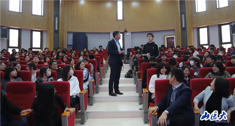 在随后的互动环节中,同学们积极踊跃提问,围绕 “英语口语能力提升”“职场能力塑造”“文化适应与融入” 等诸多方面展开深入交流。Adam先生及团队成员一一耐心解答,给予了细致且专业的建议。