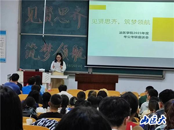 为提升法医学院莘莘学子对法医学专业研究生考试、公务员考试认识,熟练掌握相关专业应试技巧。5月28日,我院分团委在中都校区慎思B101教室举办以“见贤思齐 筑梦领航”为主题的2023年度考公考研交流会。本次交流会由院学生会学习部长田文瑞主持,200余名本科生参加。
