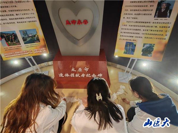 活动伊始,大家身穿白大褂,跟随讲解员的脚步重温了生命科学馆的六个展厅。一个个人体和器官标本,一幅幅展板,形象地展现了生命的孕育、人体的结构和功能、人类基因组计划、医学影像科技、未来医学等五个部分的内容,加深了同学们对医学知识的理解。当讲解员带领大家走入第六个展厅--“生命的永恒”时,同学们的心情变得有些沉重。这里展满了遗体捐献者的捐赠申请,着重介绍了两位遗体捐献者的感人事迹,其中一位是山西省首例捐献者巩象巽。他曾是山西大学教授,因突发脑溢血去世后把遗体捐献给了我校,标本费也不忘作为最后的党费转交党组织。在场的同学无不为他们的无私和伟大而动容。